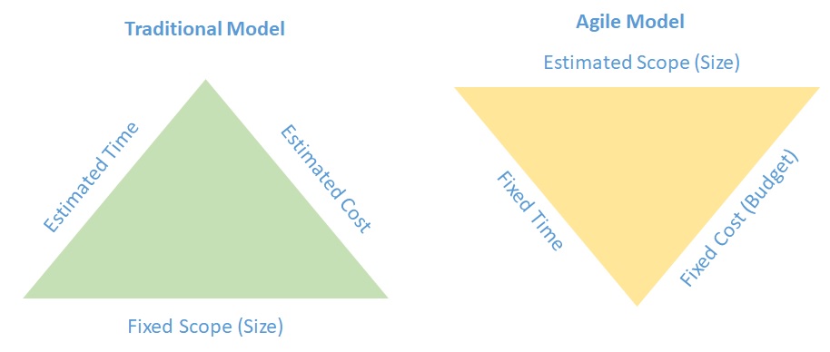 In agile methodology, every iteration follows requirement gathering, development, and testing cycles which typically follows agile pyramid model. This is inverse of traditional pyramid model of Waterfall methodology. Interestingly, the traditional pyramid considers fixed scope whereas agile pyramid follows estimated scope during agile contracts negotiations.