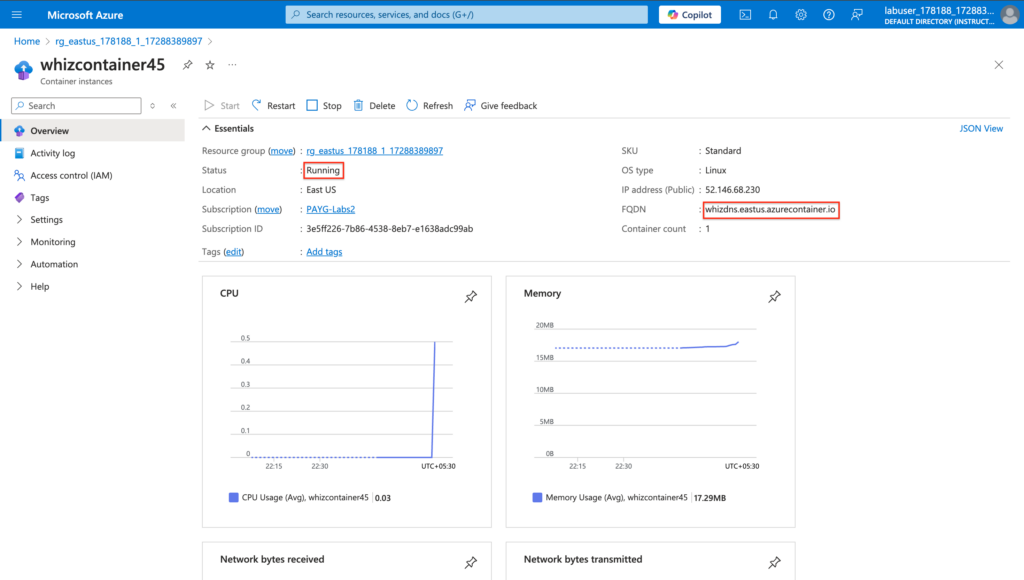 On the Overview page of the Azure Container Instance, check whether the instance status is ‘Running.’ Locate the Fully Qualified Domain Name (FQDN) and copy it.