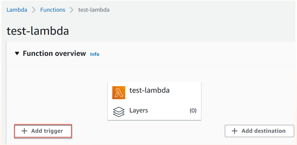 1. From the Lambda function page, click Add trigger. The Trigger configuration window opens.