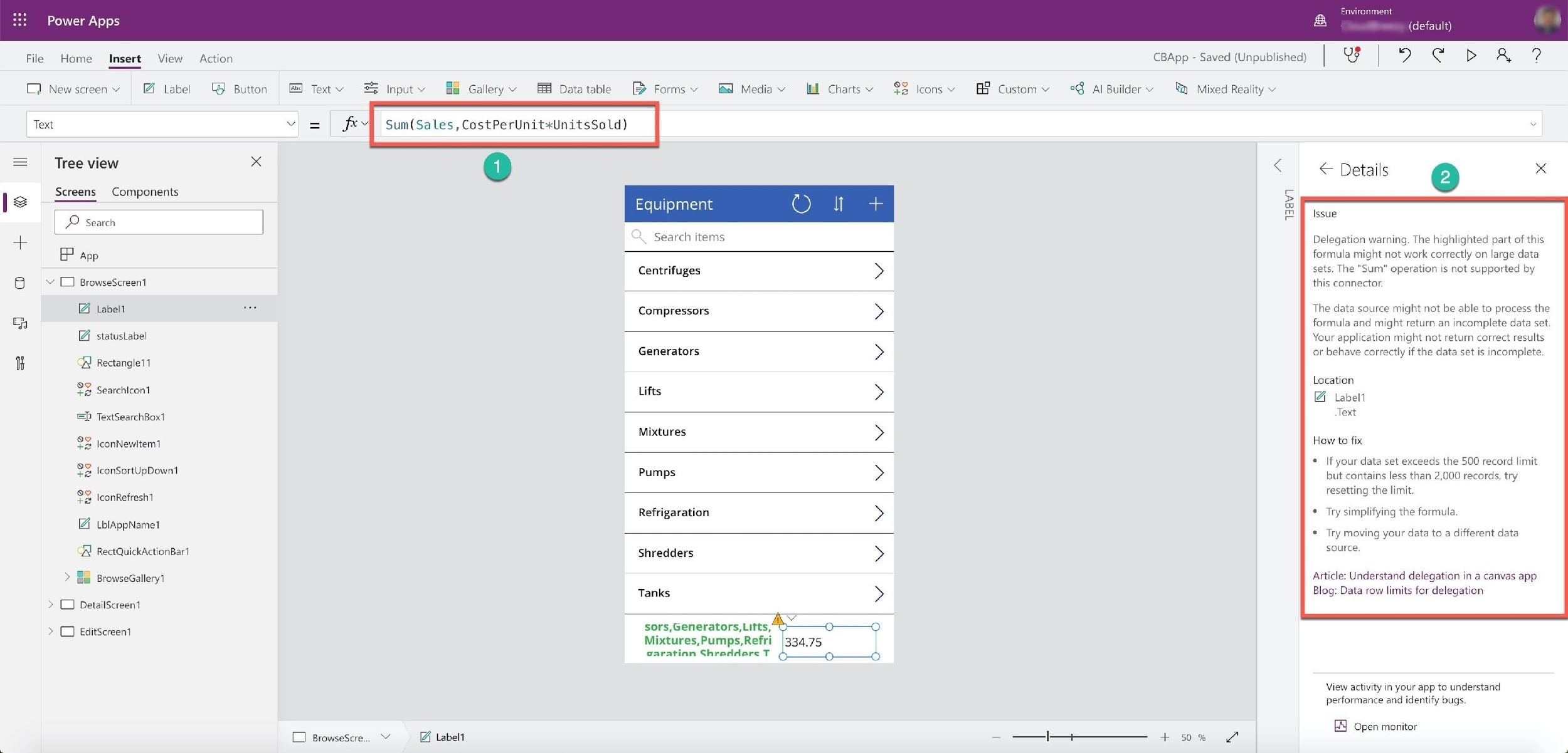 When a connector does not support the function delegation, App Checker will let you know. Even the Sum function (Number 1) is on the list of potential delegable functions, but the SharePoint connector does not support this functionality. And App Checker issues the Delegation warning (Number 2).