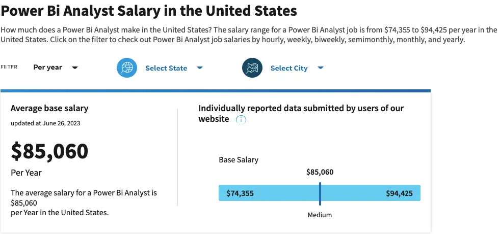 According to salary.com, the salary for a Power Bi Analyst job can vary from $74,131 to $94,139 per annum in the United States. Salary ranges can differ based on various factors, including location, experience, industry, company size, and individual skills.